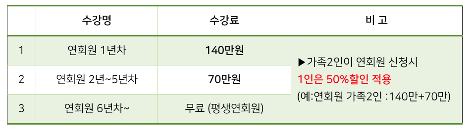 연회원들의 가족들을 대상으로 첫 해 50%할인 혜택을 제공해드리고 있습니다.