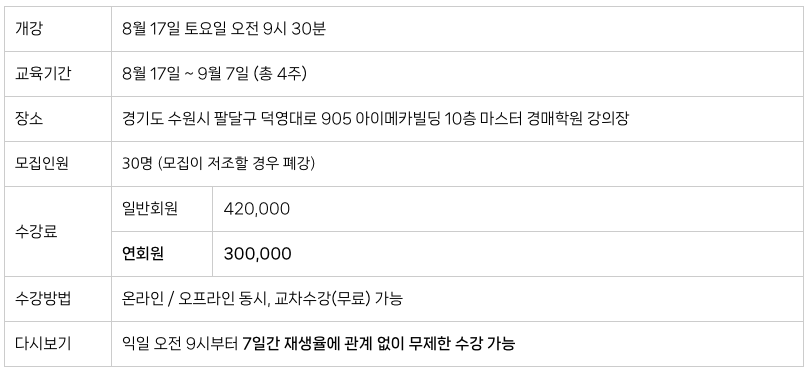 마스터경매학원은 강의 내용의 지연, 변경, 오류 등으로 인한 수강생의 손해에 대해 책임을 지지 않습니다.