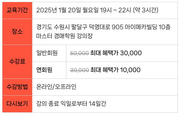 강의 녹화 자료(영상)의 저작권은 강사와 마스터경매학원이 공동으로 보유하며, 학원은 이를 운영, 배포, 관리할 권리를 가지며 무단 사용 및 배포를 금지합니다.