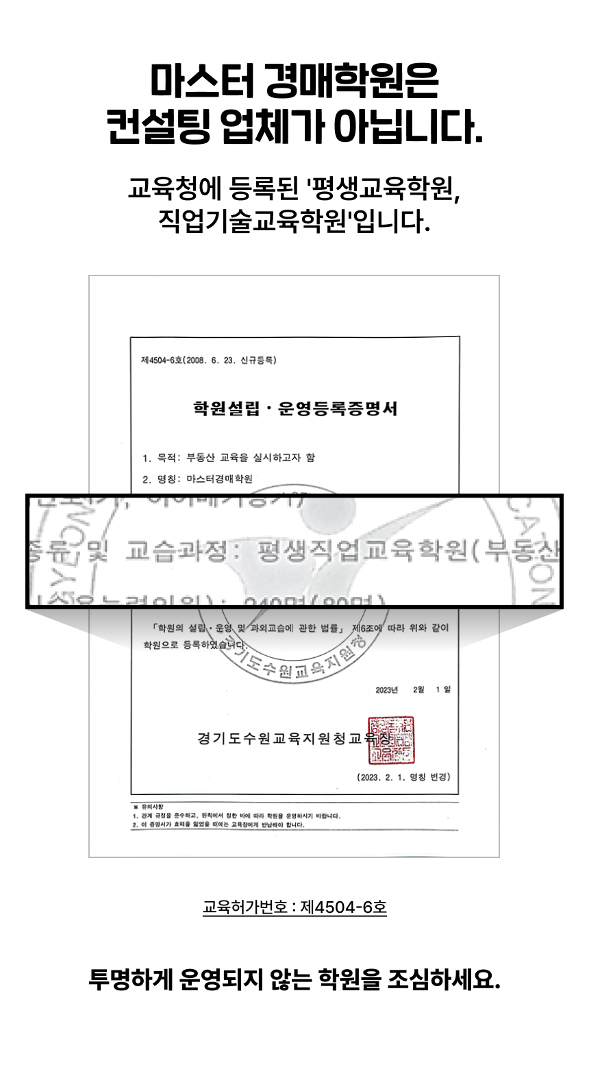 마스터경매학원은 강의 내용의 지연, 변경, 오류 등으로 인한 수강생의 손해에 대해 책임을 지지 않습니다.