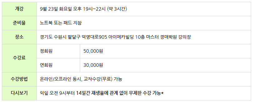 장소: 수원 마스터 경매학원 (온라인 동시수강 가능)