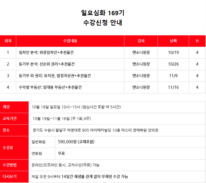 마스터 경매학원에서 진행되는 특강의 수강 신청 마감 기한은 강의 당일 시작 한 시간 전까지입니다.