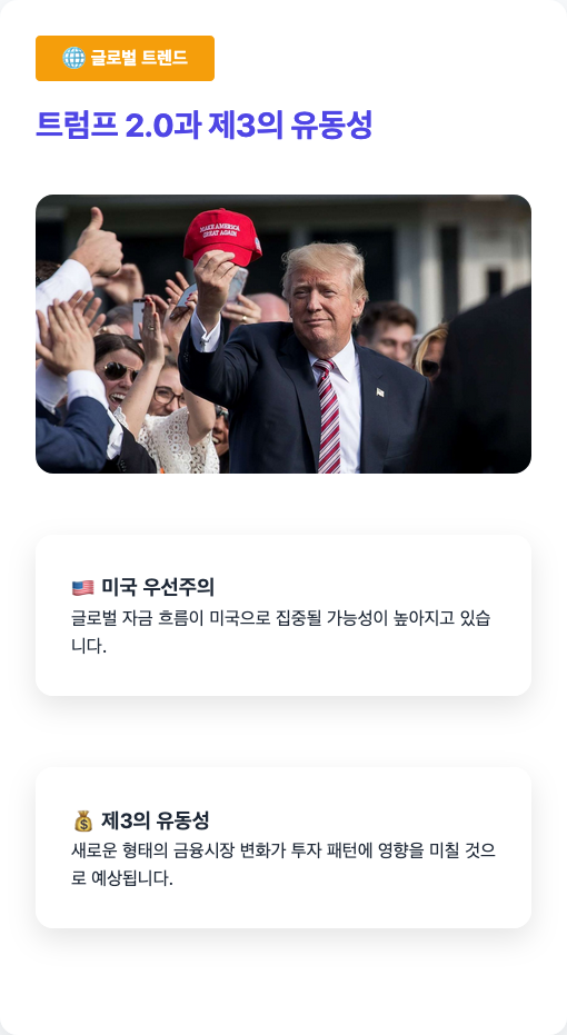 트럼프 2.0 시대에는 미국 우선주의와 보호무역주의가 강화되면서, 글로벌 자금 흐름이 미국으로 집중될 가능성이 있다.