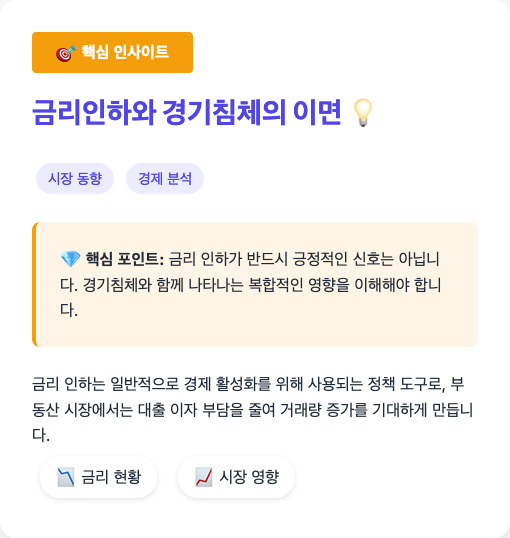금리 인하는 일반적으로 경제 활성화를 위해 사용되는 정책 도구로, 부동산 시장에서는 대출 이자 부담을 줄여 거래량 증가를 기대하게 만든다.