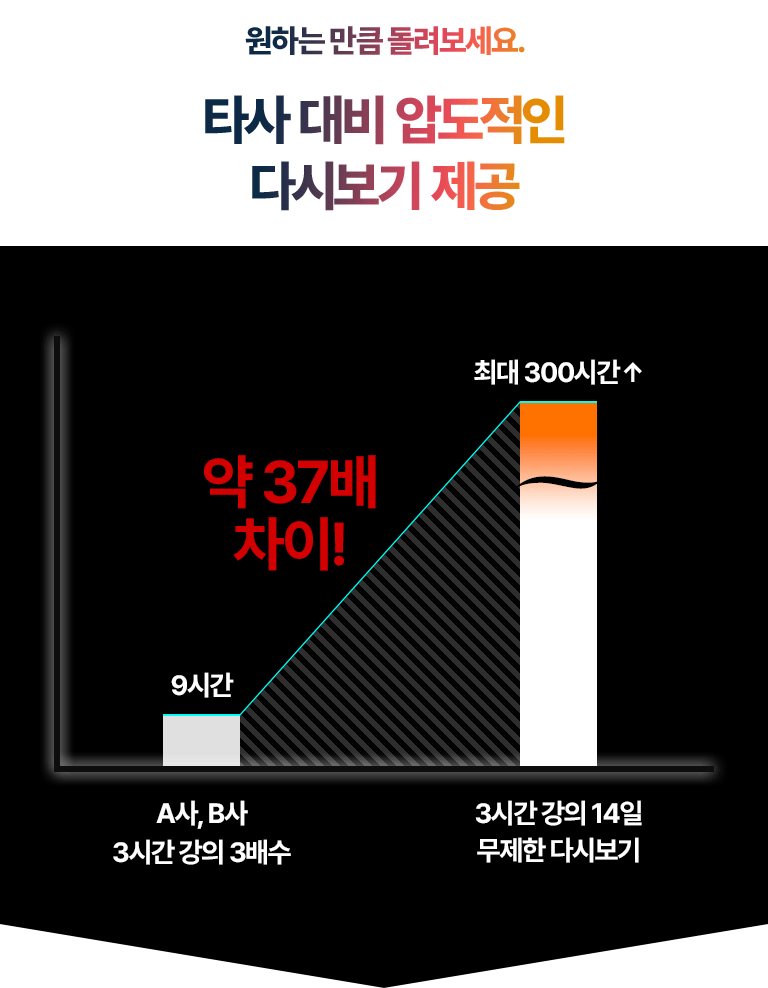 "무한 반복 다시보기", "무제한 다시보기"란 제공된 기간 내 재생율에 관계 없이 반복 수강 가능함을 의미합니다.
