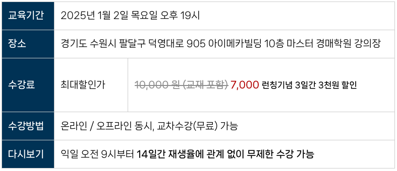 마스터경매학원은 강의 내용의 지연, 변경, 오류 등으로 인한 수강생의 손해에 대해 책임을 지지 않습니다.