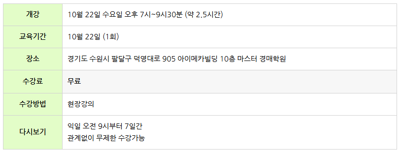 마스터 경매학원에서 진행되는 특강의 수강 신청 마감 기한은 강의 당일 시작 한 시간 전까지입니다.